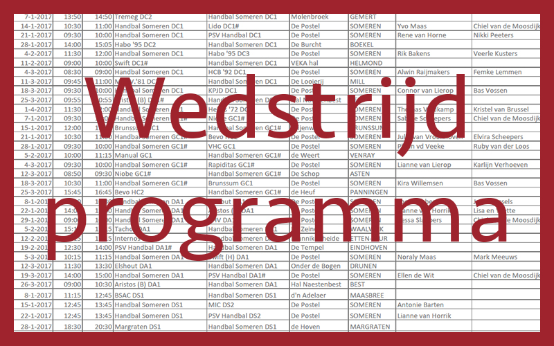 Het wedstrijdprogramma voor de tweede helft van de zaalcompetitie is bekend! Naast de vertrek- en aanvangstijden staat op dit programma de indeling voor zaalwacht en scheidsrechters. Kun je niet op het moment dat je staat ingedeeld? Dan dien je zelf voor vervanging te zorgen.
